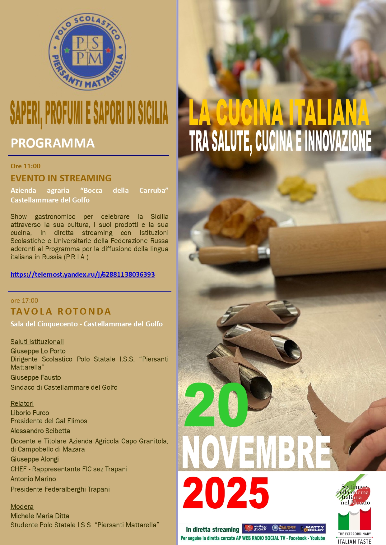 Nell’ambito della Settimana della Cucina Italiana nel mondo, Giovedì 20 Novembre 2025 si svolgerà la X edizione della “Settimana della cucina italiana nel mondo”, evento promosso dal Ministero degli Esteri. Il tema di quest’anno, “Dieta Mediterranea e Cucina delle Radici: Salute e Tradizione”, mira a presentare la cucina italiana con particolare riferimento alle tradizioni e al riconosciuto ruolo della Dieta Mediterranea per la tutela della salute, nel quadro di uno stile di vita sano, equilibrato e sostenibile.